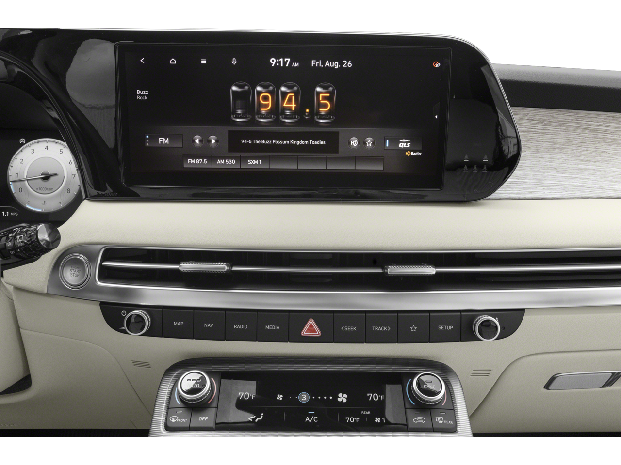 - Radio: AM/FM/MP3 Premium Audio System -inc: 630-Watts, Harman Kardon audio system w/12-speakers, Quantum Logic Surround, Clari-Fi, 12.3" color touchscreen display, onboard navigation w/traffic flow including incident data via HD Radio (HERE), Over-the-Air (OTA) map updates, SiriusXM, Android Auto and Apple CarPlay, USB, dynamic voice recognition, rear seat quiet mode, passenger talk (in-car intercom), Bluetooth hands-free connectivity w/multiple device connection and Bluelink Connected Car System